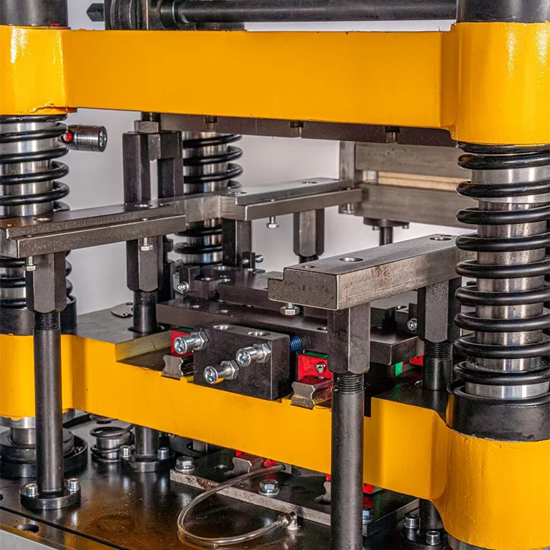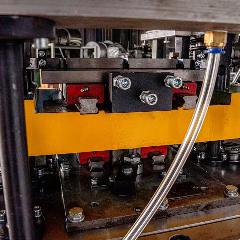 Описание производственной линии: Линия интегрирована с двухбухтовой автоматической разматывающей машиной для попеременной подачи материала. Рулонный материал после обработки в правильном устройстве подаётся в зону формования сервоподающим механизмом (точность позиционирования ±0,01 мм). Штамповка осуществляется совместной работой верхней и нижней матриц, приводимых электродвигателями. Сформованные рёбра проходят через механизм регулировки шага волны (регулировка в диапазоне 4–12 мм), затем поступают в онлайн-модуль контроля для проверки на заусенцы и деформацию. Готовая продукция через буферное устройство транспортируется к режущему механизму, где обрезается до заданной длины и выгружается.